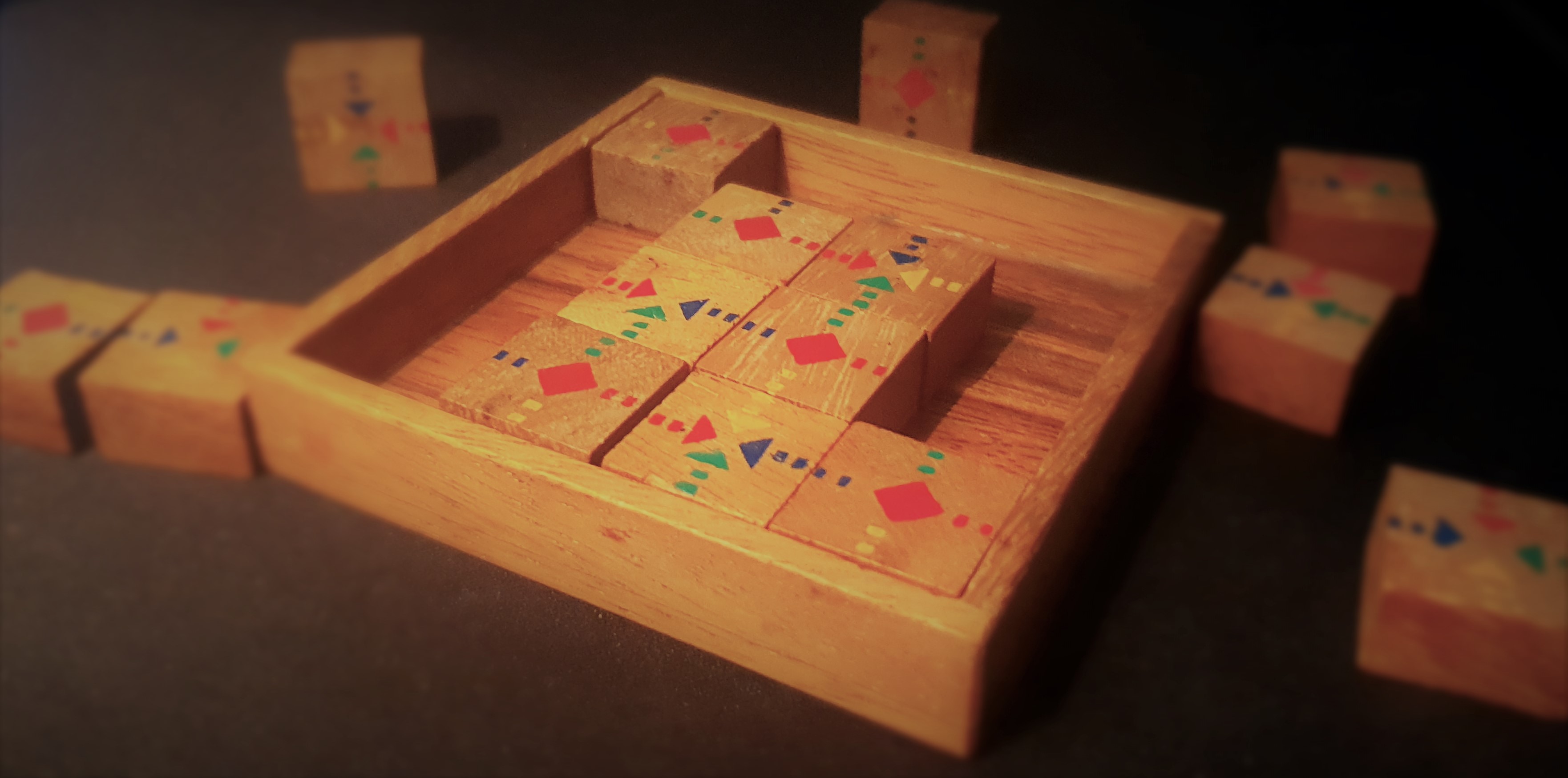 Based on a 4x4 grid of wooden blocks, each block has a graphic on its top-side. Each graphic indicates a colour for each edge of the square. Half the blocks also contain a diamond in the centre. The other half do not.